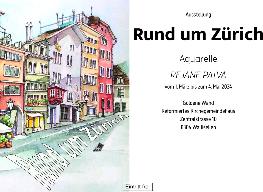 Minha nova exposição com aquarelas de Zurique estará patente até dia 4 de Maio de 2024 em Wallisellen, na Suíça. Um bom programa para quem, assim como eu, é apaixonado pela beleza singular dessa cidade.